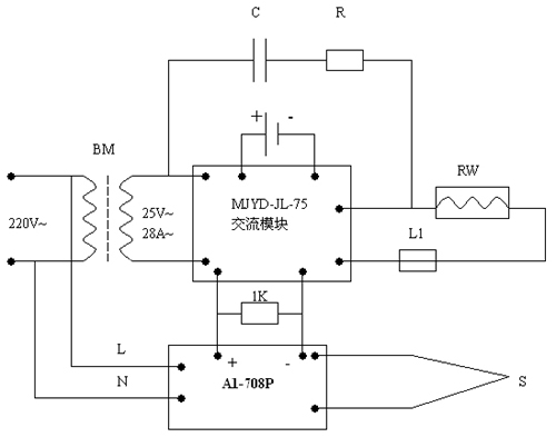 電路說明:交流電源經變壓器降壓后使用,輸出電壓25V,輸出電流28A、MJYD-JL-75為晶閘管智能模塊,內含晶閘管和移相控制電路,輸出電壓450V,電流75A,L1為過流保護熔斷器,RC為過壓保護阻容元件。RW為電爐絲。A1-708P輸出為0-10MA電流,經過1K電阻后,輸出變為0-10V直流電壓,滿足晶閘管模塊的輸入電壓要求。